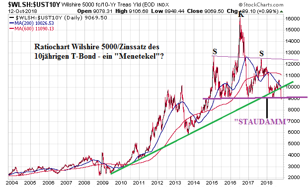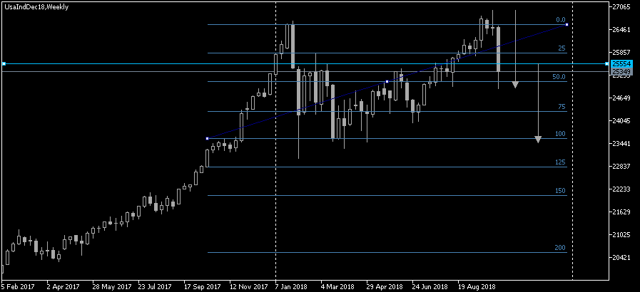 Der Dow bildete bereits im Januar ein neues Hoch aus, und fiel daraufhin unmittelbar auf den letzten Widerstand im vorigen November zurück. Auf Wochenschlussbasis wurde das Jahrestief erst im März ausgebildet. Am Freitag vor 3 Wochen markierte der Dow ein neues Jahreshoch, bildete in der Folgewoche eine Inside-Kerze und in der folgenden Woche wurde wieder ein neues Hoch erreicht, das der Dow im Wochenschluss aber nicht bestätigen konnte: "Umkehr-Kerze". Das war der dritte Anlauf für ein Jahreshoch mit Abpraller. Das nutzte der Bär für eine Attacke. Diese war überraschend erfolgreich, da der Kurs nicht nur auf die August-September-Unterstützung zurückfiel, sondern ohne auf Käufer zu stoßen, weiter nach unten durchschlug. Dennoch ist der Wochenschluss oberhalb der Hälfte der Jahresrange geblieben. Genau im Punkt der maximalen Unbestimmtheit. Ich habe in der Chart eine Aufteilung der Jahresrange, wieder Wochenschlusskurse, nach Quartilen (25%-Abstände) vorgenommen (0,25,50,75). Man erkennt, dass sich die Wochen des Jahres 2018 in diese Quartile gut einsortieren lassen. Wie geht es nun weiter?