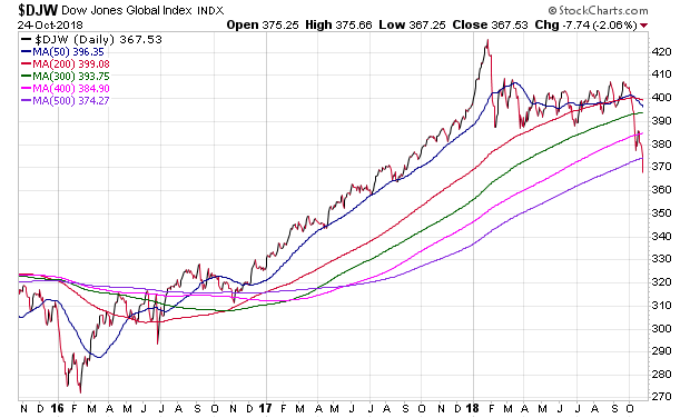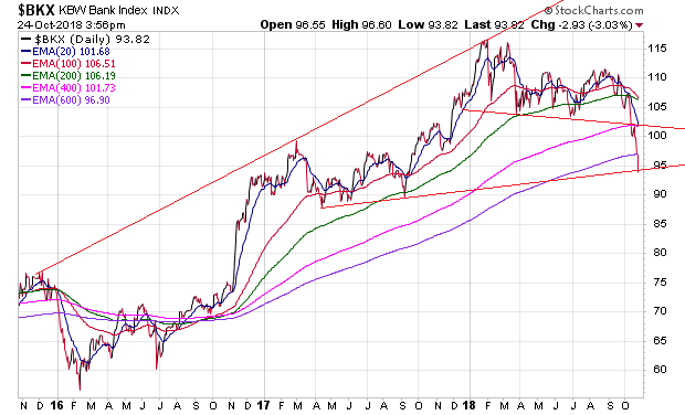 Alle Leitindizes haben heute auf Tagestief unterhalb von MA 200 geschlossen. MA 200 ist jedoch beim Bankenindex schon längst kein Thema mehr. Ich habe den Chart mit einem EMA-Fächer versehen. Wie heftig die Kurskurve den stark aufgeweiteten Fächer innerhalb weniger Wochen durchschnitten hat, ist einfach grässlich bärisch.
