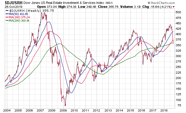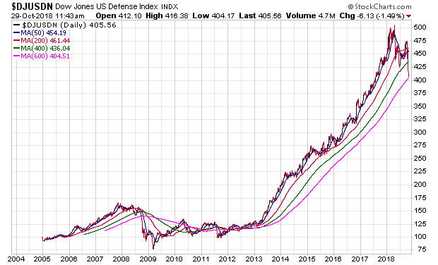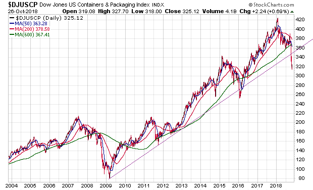 Am Wochenende habe ich mir einmal alle Charts dieser Indizes mit dem Kürzelanfang $DJUS.. angeschaut. Von den fast 100 sind lediglich noch 17 als "bullisch" zu bezeichnen, allen voran der Restaurants & Bars Index ($DJUSRU). Alle anderen zeigen bereits deutliche Anzeichen einer Wende bzw. befinden sich bereits im Bärenmodus. Besonders interessant finde ich ich den angehängten Chart.