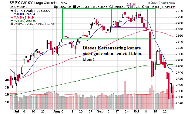 Die Kerzensettings im September waren nicht dazu angetan, höhere Kurse zu erwarten. Die letzten ATHs waren typische "Erschöpfungstops", wie das Beispiel des SPX-Charts erkennen lässt.