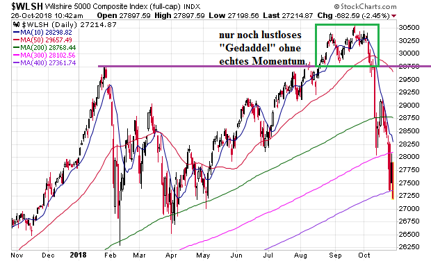 Hier muss es heißen: ... bewegen sich die Neubestellungen und die Auslieferungen ... aktuell in etwa auf Höhe des Toplevels von 2008. Die Tops von 2000, 2008 und 2018 liegen lediglich bei den Investitionsgütern auf etwa gleichem Niveau. Neuer Sachverhalt: Geschäftsaktivitäten ohne Aufbau von Lagerbeständen und ohne Finanzsektor 2018 auf in etwa gleichem Niveau wie 2008 - Gesamtkapitalisierung des Aktienmarktes (Wilshire 5000) bei Top 2007 16000 Mrd. USD - September 2018: rund 30500 Mrd. USD (fast verdoppelt). Dies macht besonders deutlich, wie weit sich der Aktienmarkt von der wirtschaftlichen Realität entkoppelt hat. Aktuell bewegt sich die WLSH-Kurve im Modus MA10 nach unten (Crash-Modus).