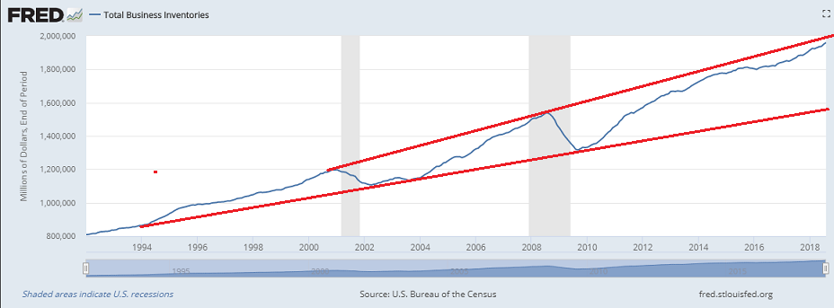 Diese tragen zu einem wesentlichen Teil zum GDP bei. Hier der FRED Chart zu "Total Business Inventories" per Juli 2018 (fast 2000 Mrd. USD). Demgegenüber bewegen sich die Neubestellungen und die Auslieferungen in fast allen Geschäftssektoren (Produktion, Großhandel, Einzelhandel) in etwa auf Höhe der Toplevels von 2000 und 2018.