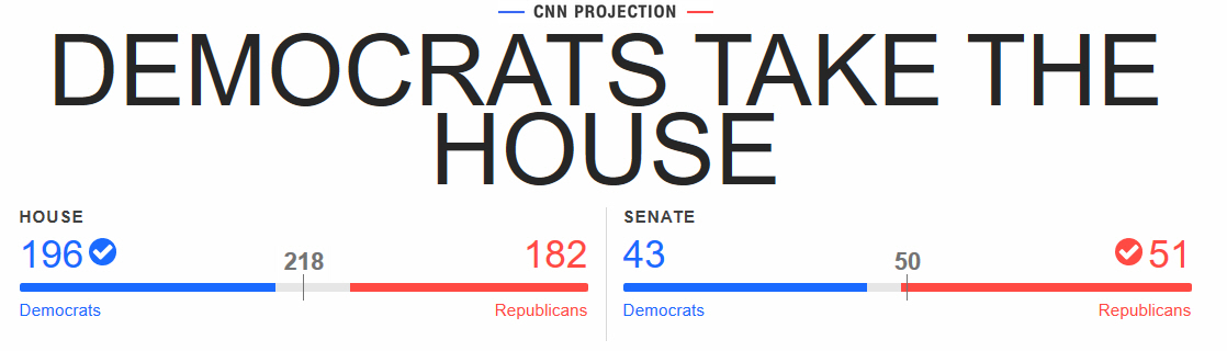 wie wird sich das auf die märkte auswirken? viele auguren sehen das erstaunlicherweise leicht positiv wenn sich die beiden häusern gegenseitig blockieren, so könne man keine unnötigen gesetze verabschieden. für einige projekte der regierung könnte das aber die endgültige blockade sein, angefangen bei der rückabwicklung von obamacare, der angekündigten steuersenkung für die mittelschicht, der dringend notwendigen infrastrukturinitaitive sowie auch der absurden grenzmauer.
