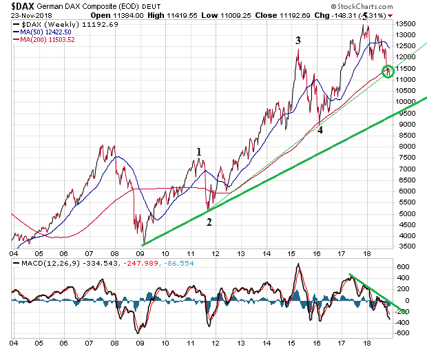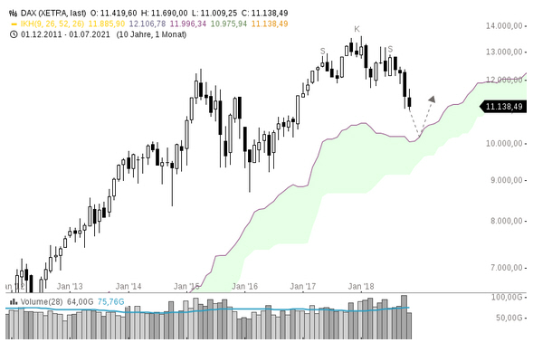 Die onvista-Prognose für den DAX ist mir zu wolkig. Ich halte mich lieber an handfeste Parameter wie MA200 im Wochenchart, unterhalb dessen die Kurskurve gerade herum turnt. Baut sich das Unterschreiten dieses Durchschnitts noch etwas aus, werde ich den Bärenmarkt ausrufen, da der Bullenmarkt nach Elliott bereits vollendet ist. Ich gehe davon aus, dass dessen Endpunkt nicht auf der dicken grünen Geraden liegen wird.