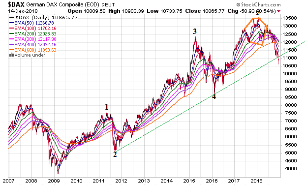 Das siehst du völlig richtig. Insbesondere die Elliott-Wellen-Zählung deutet auf ein Ende des Bullenmarktes und den Beginn eines Bärenmarktes hin, aber auch das ausgeprägte finale Top ("Diamant") und das Setting des EMA Fächers.