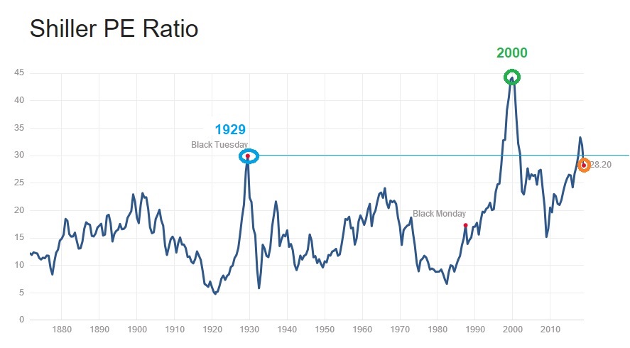 Der Durchschnitt des Shiller-KGV liegt bei lediglich 14,6. Heute haben wir 28,2. Es gibt daher noch 50 % "heiße Luft" in den Indizes. Meist aber wird bei einem Crash der Mittelwert noch deutlich unterboten, wie 1930 (KGV 6) oder 1983 (KGV 7).