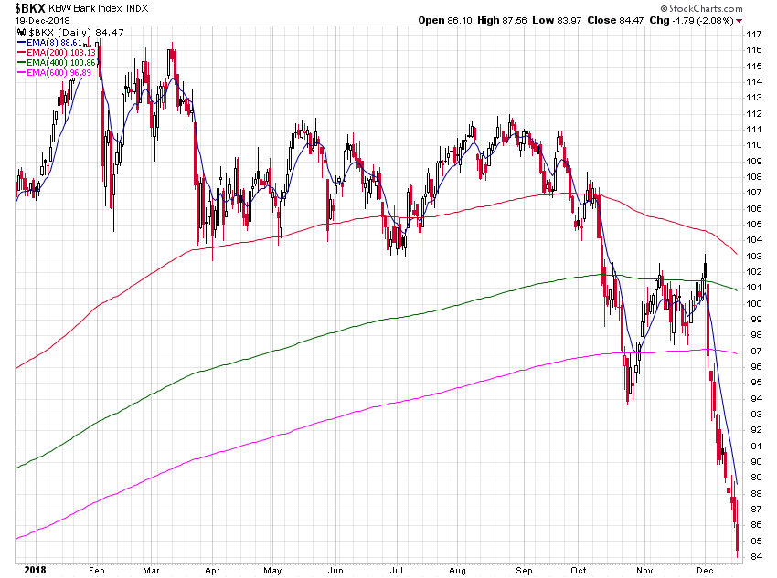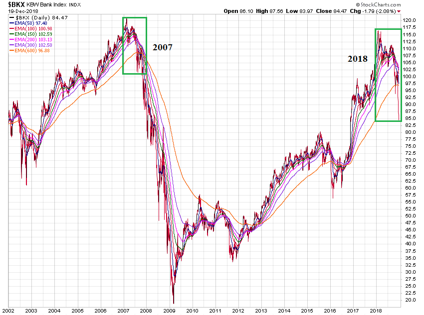 Das Top des BKX war 2007 bei 120 (siehe Chart in # 044). Aktuell (Stand 85) notieren US-Banken im Schnitt 33 % unter ihrem damaligen Top. Dieses Top ist jedoch 11 Jahre her, so dass man noch einmal schätzungsweise 40 % Kaufkraftverlust des Anlagebetrags infolge der Inflation einbeziehen muss. Für einen Ausgleich sorgten ggfs. Dividenden.