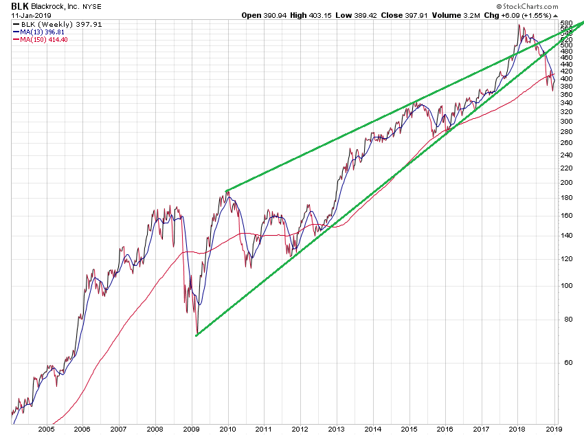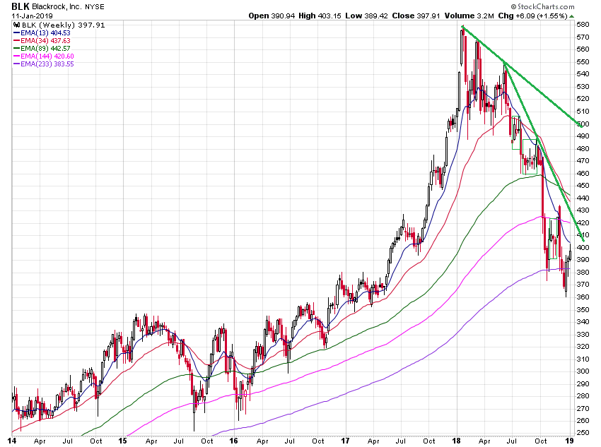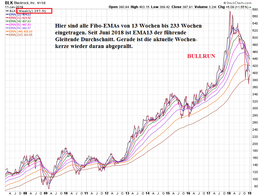 äh, von BlackRock! Deren Chart ist an einem Punkt angelangt, der großen Anlass zur Sorge bietet. Warum ich in diesen Wochenchart speziell Fibonacci-EMAs eingetragen habe, mögt ihr selbst ersehen.