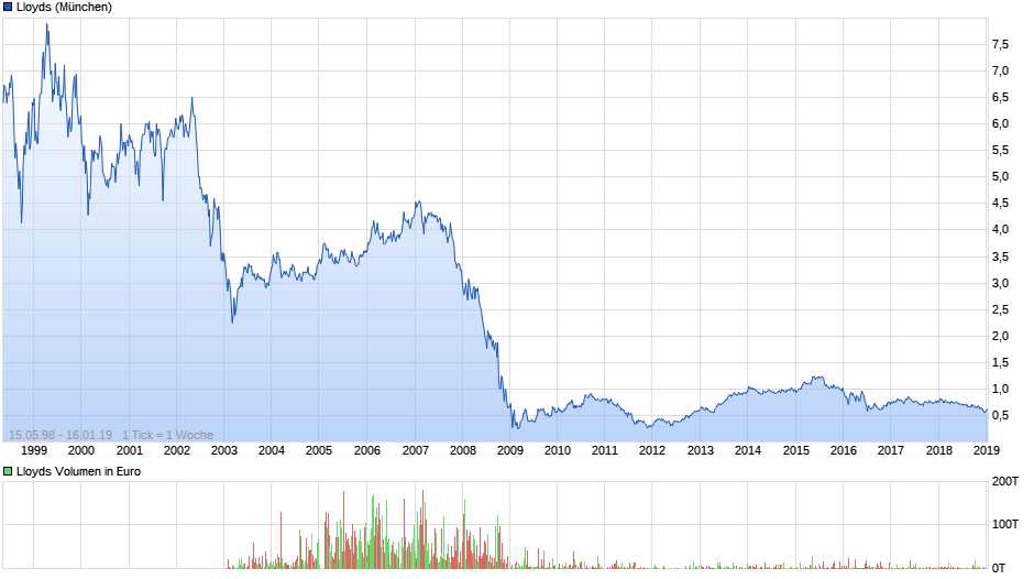 Allerdings haben sich die GB-Banken (wie bei uns Deutsche Bank und Commerzbank) größtenteils bis heute nicht vom 2008/2009-Debakel erholt. Sieht man sich z. B. den Chart von Lloyds an (unten), scheint nach unten nicht mehr allzu viel Platz bzw. Luft zu sein.