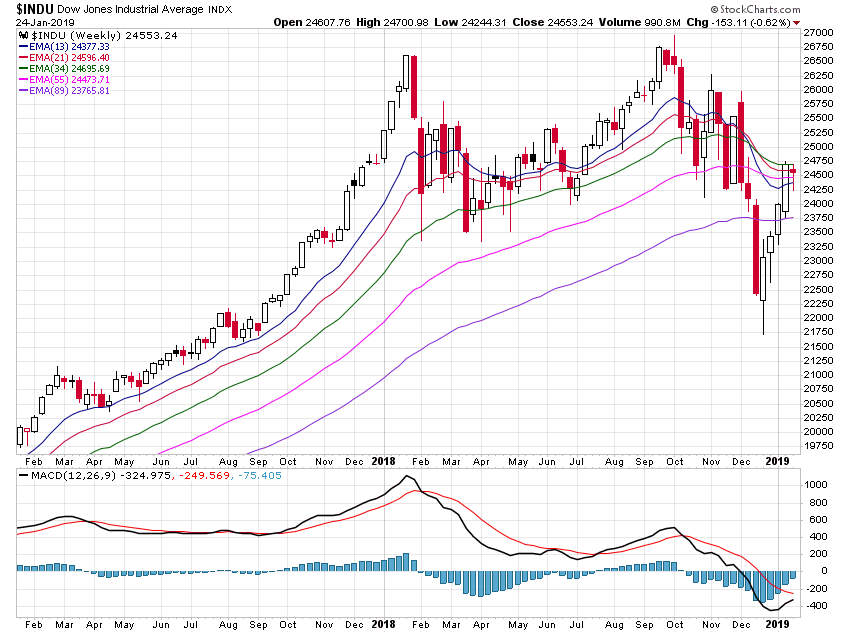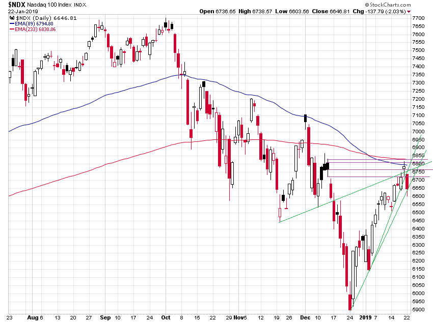 Im Chart zeigt sich aktuell eine isoliert stehende Narrow Bar Kerze, ein sog. Gap Island, das gewissermaßen von EMA89 und EMA233 "gedeckelt" wird. Sehr interessant finde ich auch die Beziehung dieser Kerze zur letzten der drei schwarzen Kerzen im Dezember 2018. Dieses Setting bleibt höchst spannend.