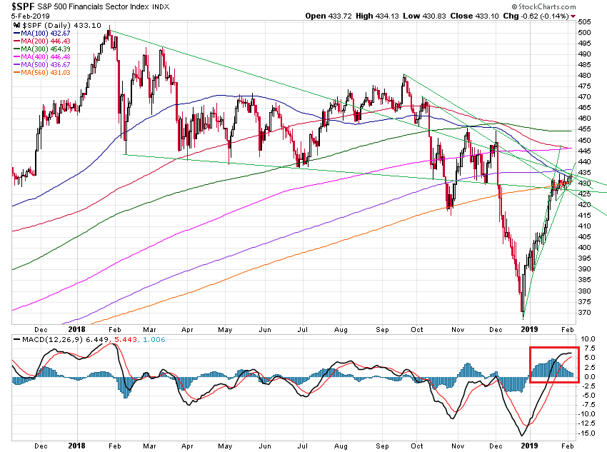 zwischen den technischen Settings der Leitindizes und denen der weitaus größten Anzahl der Sektor- und Branchenindizes ($DJUS...). Die drei größten Sektoren im SPX sind: Industrials, Financials und Retail. Ersterer sieht im Chart noch recht aus, doch die beiden anderen sind als kritisch einzustufen. Beide stehen wieder auf der Kippe.