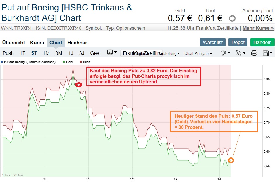 Der bis Juni laufende OS-Put auf Boeing (mit Hebel 50 beim Kauf, jetzt 60) brachte innerhalb von nur vier Handelstagen einen Verlust von 30 Prozent. Damit war ja auch zu rechnen (siehe Kommentare oben).