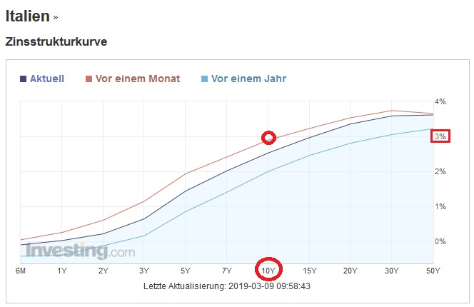 Wenn eine Großbank von der EZB z. B. 10 Milliarden Gratiskredit mit zehn Jahren Laufzeit erhält und davon (frisch emittierte) italienische Staatsanleihen mit zehn Jahren Laufzeit kauft, erhält diese Bank zehn Jahre lange annual die 3 % Zinsen, die Italo-Bonds zurzeit abwerfen (siehe Chart unten). Die Bank erhält somit in den zehn Jahren ingesamt rund drei Milliarden an Zinsen, zahlt aber an Draghi überhaupt keine Zinsen für den TLTRO-Kredit. Diese drei Milliarden Euro Zinseinnahmen über die Laufzeit sind somit ein Reingewinn für die Banken. Das Ganze ist also ein gigantisches Gratis-Rekapitalisierungsprogramm für die strauchelnden Eurozonen-Banken, die bezeichnenderweise wegen Draghis NIRP am Stock gehen!