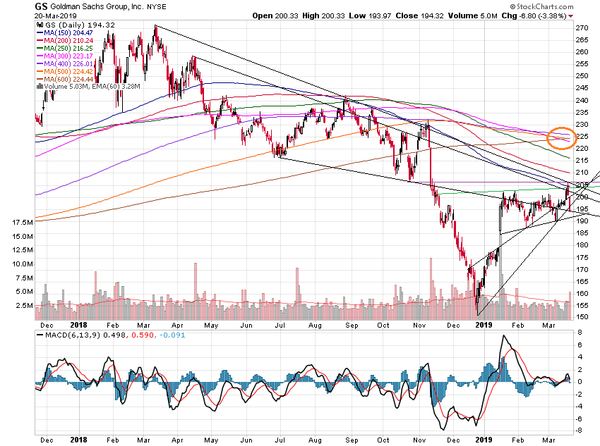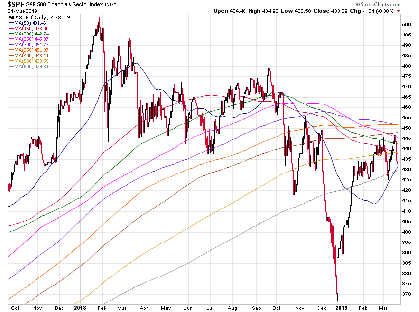 Die Masse schaut nur auf die Entwicklungen der Standard MAs 50 und 200. Andere Konstellationen bleiben ausgeblendet. Bei den meisten Aktienwerten nähert sich MA 50 mit Riesenschritten MA 200 von unten her an (Programmierung durch Sinuskurven-artige Bilder). Dies gilt vor allem für die Leitindizes. Doch wie diese "Manipulation" täuschen kann, zeige ich am Beispiel des SP Financials Index.