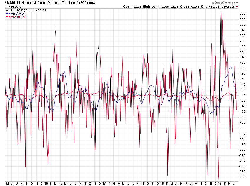 kurz vor dem Einbruch, denn diese stehen auf schwankenden Böden, in die man ein paar "Betoninjektionen" gesetzt hat, die jedoch kaum nachhaltig sein dürften. Dies lässt sich aus den McClellan Oszillatoren zu den marktbreiten Indizes Nasdaq Composite und NYSE Composite schließen.