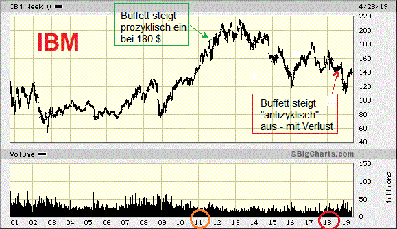 D.h. Buffett hat mit seinem prozyklischen IBM-Kauf nahe dem Hoch einen großen Verlust eingefahren. In der Anfangszeit kaufte Buffett noch antizyklisch bei Schwäche. Das war besser - und entsprach auch den Lehren seines Ziehvaters Benjamin Graham.