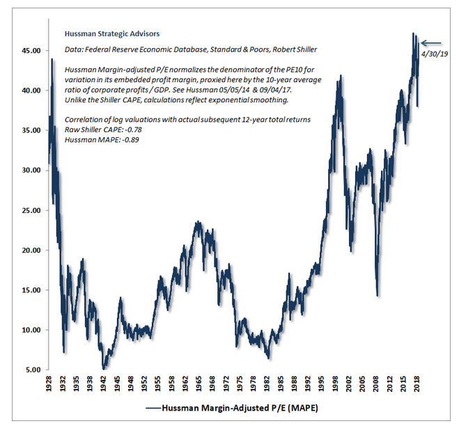 Die Überbewertung des US-Aktienmarktes ist laut Hussman inzwischen sogar noch schlimmer als 1929 und 2000. Er hat dazu auch eine Grafik [Margin-adjusted P/E] in seinem Fonds-Newsletter veröffentlicht (unten).