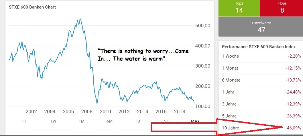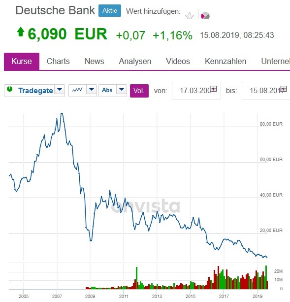 Unten als Beispiel der 15-Jahres-Chart der Deutschen Bank. Er steht stellvertretend für viele andere Banken-Charts, die - vor allem in Europa (wo NIRP am penetrantesten durchgezogen wird) - ähnlich aussehen.