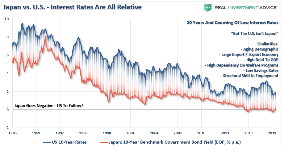 Lance Roberts (Link oben) rechnet damit, dass auch die Ami-Renditen in nicht allzu ferner Zukunft auf null fallen bzw. negativ werden. Er schreibt außerdem, dass bei Nullzinsen kein BIP-Wachstum möglich sei.