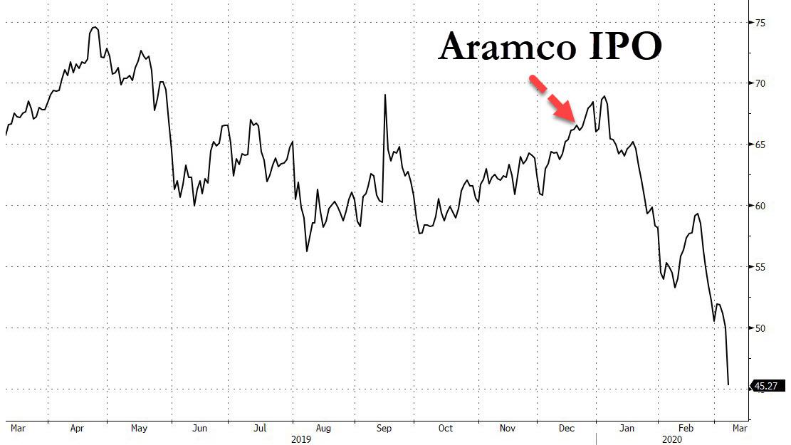 Following Friday's shocking collapse of OPEC+, when Russia and Riyadh were unable to reach an agreement during the OPEC+ summit in Vienna which was seeking up to 1.5 million b/d in further oil production cuts, on Saturday Saudi Arabia kick started what Bloomberg called an all-out oil war, slashing official pricing for its crude and making the deepest cuts in at least 20 years on its main grades, in an effort to push as many barrels into the market as possible.