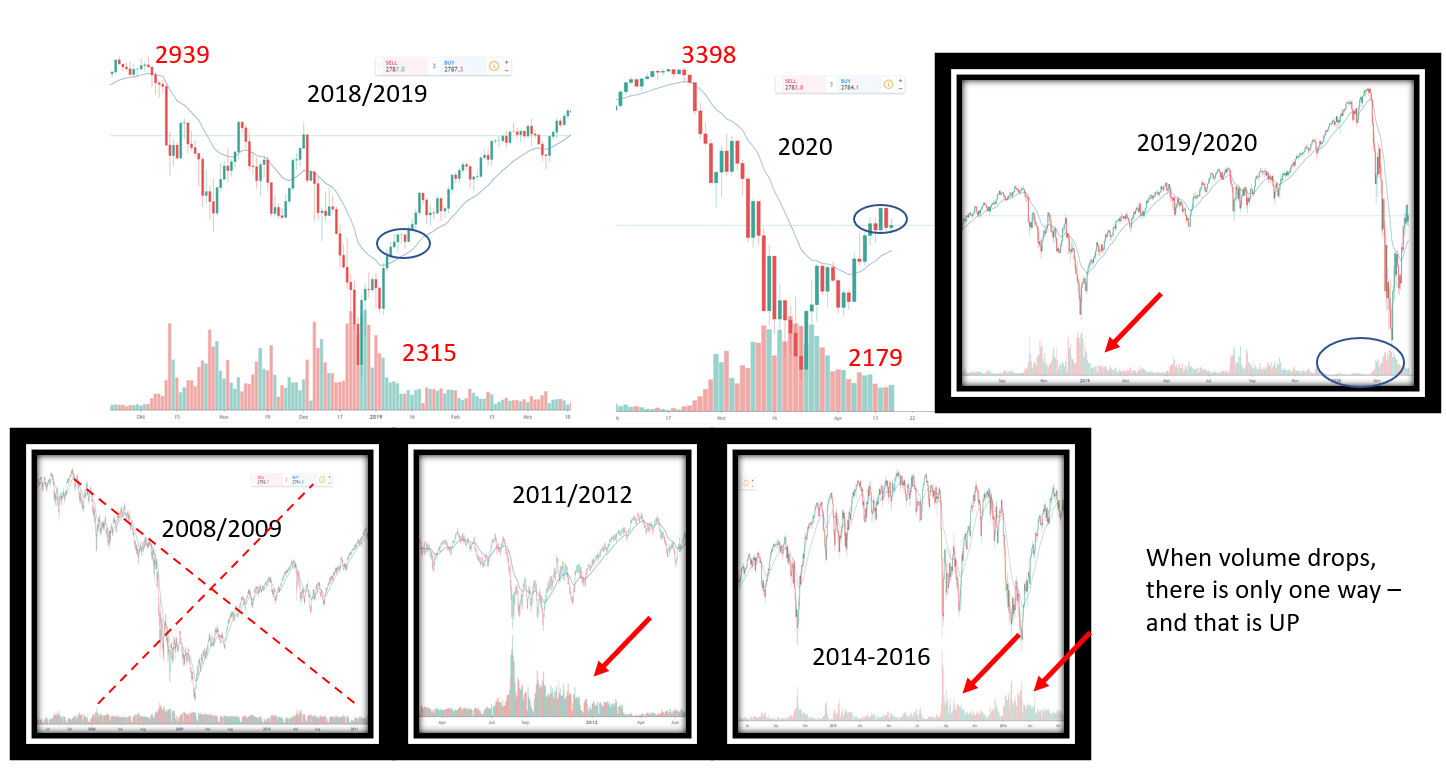 3. Wenn das Volumen deutlich nachlässt, steigt der Kurs und damit die Stimmung (Fundamentals hin oder her).