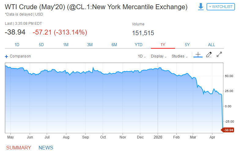 Was heute bei WTI zu besichtigen war, war eine lupenreine Marktpanik, getrieben von der Sorge, den vertraglichen Pflichten zur Abnahme nicht nachkommen zu können. Ich habe zunächst mal keine Vorstellung davon, wie das Dilemma zu lösen wäre. Das Fatale an der Sache ist, dass dieses Problem nicht einfach mit einer Geldinjektion zu lösen ist.