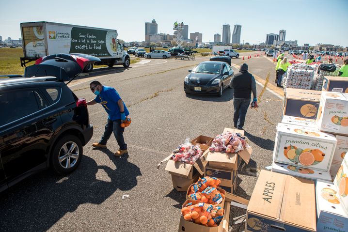 Auf einem alten Flugplatz am Rande der Stadt bietet sich ein trostloses Bild: Hunderte von Menschen warten in ihren Autos in einer langen Schlange vor einer Drive-through-Essensausgabe der Community Food Bank of New Jersey, einer privaten Hilfsorganisation. Freiwillige Mitarbeiter laden Vorratspakete mit Dosen, Gemüse und Obst in die Autos, Aufpasser in gelben Westen regeln den Verkehr und stellen sicher, dass sich niemand zweimal anstellt. Es sind Szenen wie in einem Katastrophenfilm.