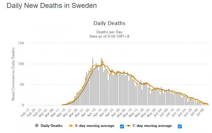 Sweden's total deaths per million in population as of July 14 is 549. That's considerably lower than the deaths per million rate in the UK, which is 662, and in Spain, which is 608. In Belgium, the death rate is 884. Moreover, the Sweden deaths per million is many times better than the rates found in New Jersey and New York: 1,763 and 1,669.....
