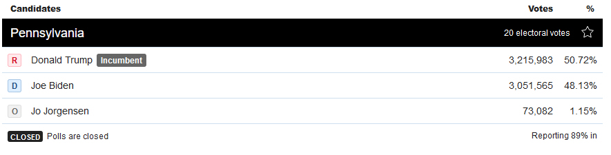 Pennsylvania, with 20 electoral votes: With 89% reported, Trump has a 50.7%-to-48.1% lead. Most votes are expected to be counted by Friday, and the most of the remaining votes outstanding are from Biden strongholds in the Philadelphia area.