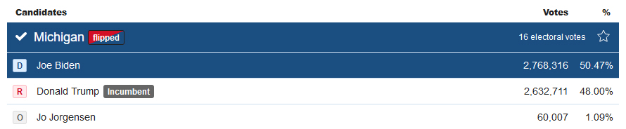 Georgia, 16 electoral votes: With 98% reported, Trump has a 49.6%-to-49.2% lead. Results from the state were delayed by a pipe bursting at State Farm Arena, where counting was being conducted.