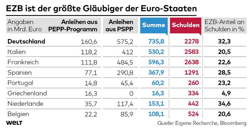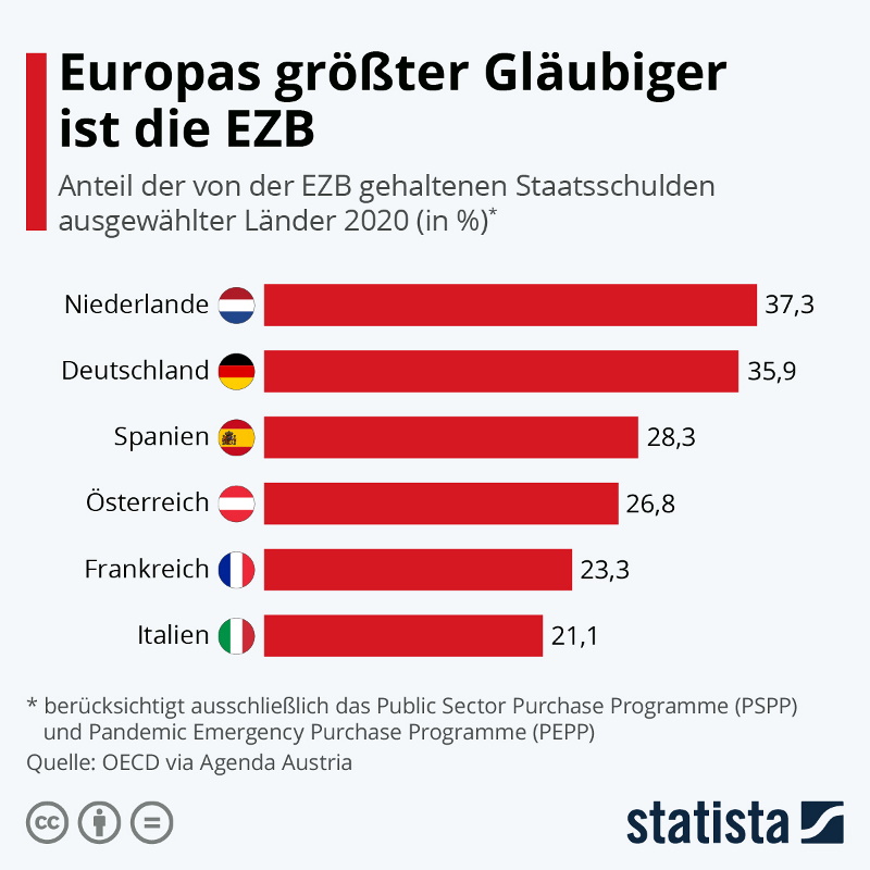 "Dass sich die EZB zur größten Gläubigerin der EU-Staaten entwickeln konnte, war 2007 nicht absehbar. In dem Jahr war die Zentralbank laut Statista noch völlig unbeteiligt an den Länderfinanzen. Ein Jahr später musste sie viele EU-Staaten unterstützen, um die Folgen der Finanzkrise abzufedern."Es trifft zwar zu, dass auch viele Banken der Eurozone wertlose bis wertarme Subprime-Anleihen aus USA gekauft hatten und teils daran Pleite gingen (einige deutsche Landesbanken) oder in so schwere Schieflage gerieten, dass sie von den jeweiligen Staaten ausgebailt werden mussten (in D. z. B. die Commerzbank nach Übernahme der Dresdner Bank).