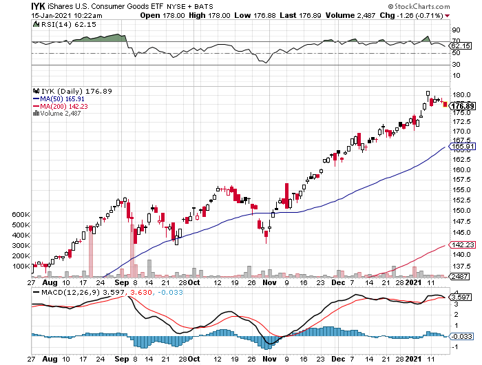 Nach unten bieten die US-Retailer-ETFs "XRT" und IYK" (Chart unten) noch reichlich Platz. Seit November sind beide im Rinderwahn-Modus.