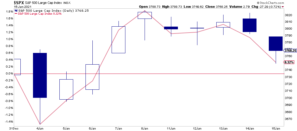 At the halfway point of January, the market has struggled to hold onto its gains. Such is surprising given the recent passage of a $900 billion stimulus bill and Biden’s proposal for another $1.9 trillion on Thursday. With another $2.8 trillion in stimulus hitting the economy, inducing the Fed to do more QE, markets were seemingly unimpressed.
