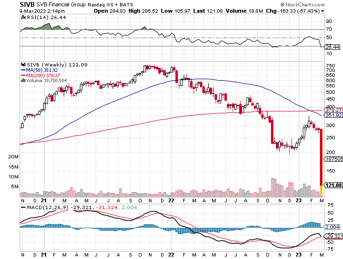 Silicon Valley Bank (SIVB) (Horror-Chart unten) die Staatsanleihen in ihrem Anlageportfolio gemäß den aktuell geltenden Bilanzregeln mit "mark to market" bewerten. Es setzte daraufhin 1,8 Mrd. $ Verlust (bei einer Marktkapitalisierung der Bank von zuvor 16 Mrd. $). Zum Ausgleich der Verluste soll nun ein kursverwässernde Kapitalerhöhung vorgenommen werden.