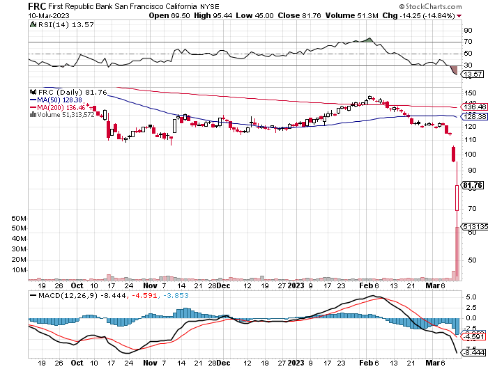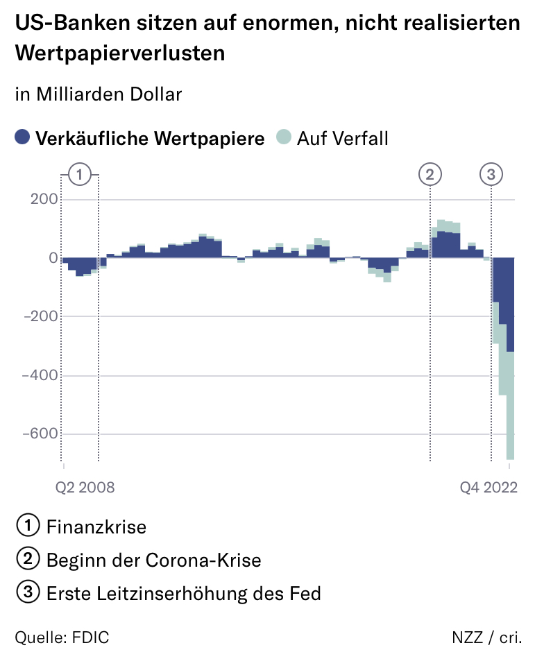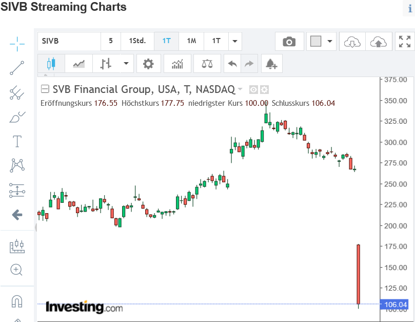 Jüngster Problemfall ist die Silicon Valley Bank, die sich auf Startup-Kredite spezialisiert hat und gezwungen ist, neue Aktien über 2,25 Milliarden Dollar auszugeben, um Abschreibungen in ihrem Portfolio aus US Treasuries und Hypothekenwertpapieren auszugleichen. Die SVB-Aktie sackte um 60 Prozent ab. [Chart in # 074] Erst diese Woche hatte die Kryptobank Silvergate Capital ihre Pforten geschlossen, ebenfalls wegen massiver Einlagenabflüsse.