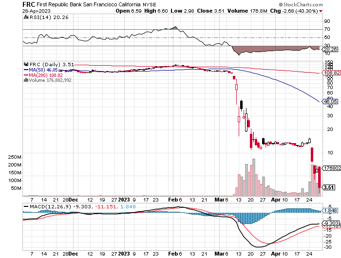 ...Das Banken-Umfeld bleibt in den USA unruhig: Die Aktien von First Republic fielen am Dienstag weiter. Der Aktienkurs des in Kalifornien ansässigen Kreditgebers, der in diesem Jahr um mehr als 90 Prozent gesunken ist, fiel um weitere 40 Prozent, einen Tag nachdem bekannt wurde, dass seine Kunden während der Turbulenzen im letzten Monat Einlagen in Höhe von 100 Milliarden Dollar abgezogen hatten.