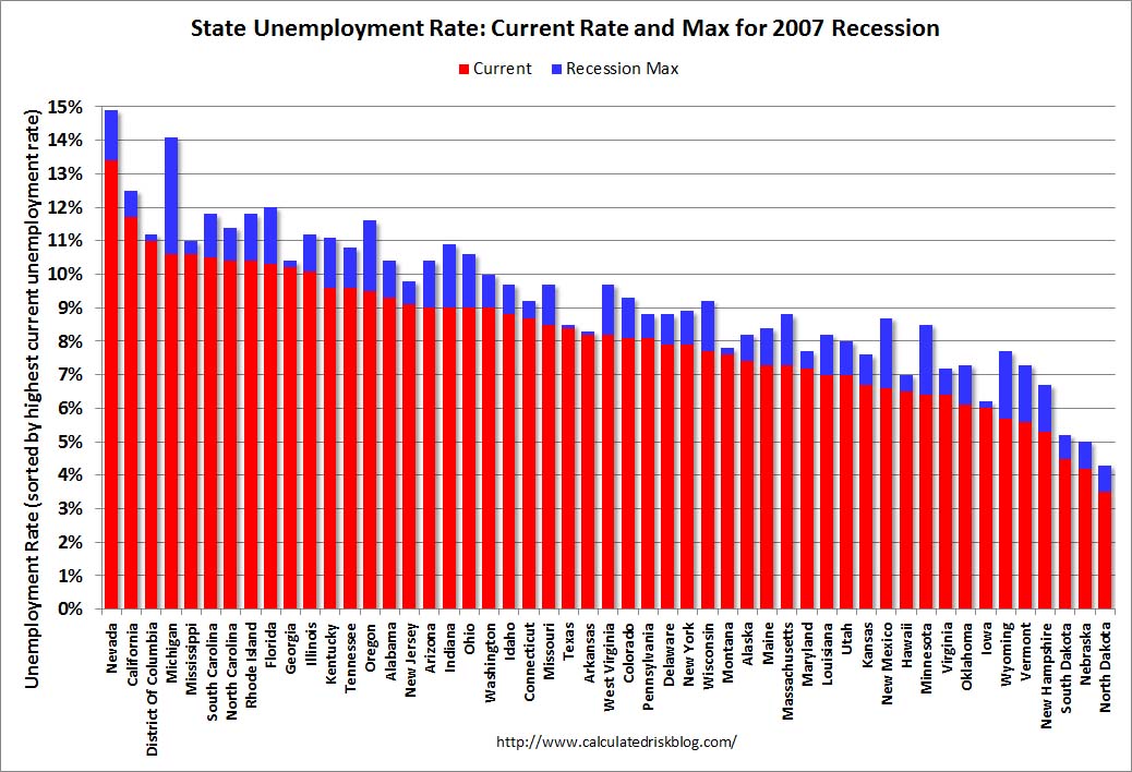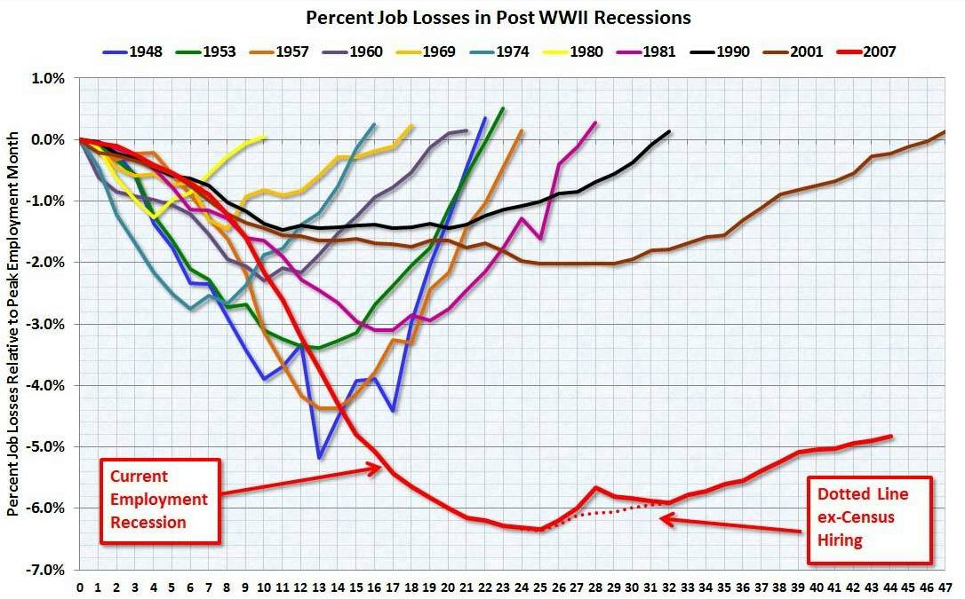 Ein Blick auf einen Chart, der den Rückgang auf dem Arbeitsmarkt in Prozent erfasst, fällt ernüchternd aus. Selbt im 44. Monat nach dem Beginn der Rezession fehlen immernoch 5% an Jobs im Vergleich zum Peak in 2007.