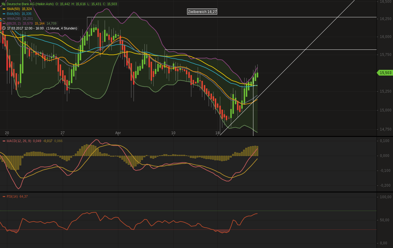 Die Deutsche Bank Aktie hat die Resistenz von 15,2 unterschritten. Im erweiterten Chart kann man schön sehen, dass die DB schon einmal diesen Kurs erreicht hat und daraufhin eine Hammerkerze im Daily Chart ausgebildet wurde. dieses mal nicht. Es wurde die 15,2 erreicht darauf hin ist der Kurs abgebrallt. Das war am 1304 auf 16 Uhr herum. Am 1804 morgens hat der Kurs der DB grün geöffnet. Es kam aber zu einem Kursabschlag und als die 15,127 gefallen sind war das für mich ein bearishes Zeichen in unserem Abwärtstrend. Ich habe 10 Aktien geshorted bei leicht über 15,1.