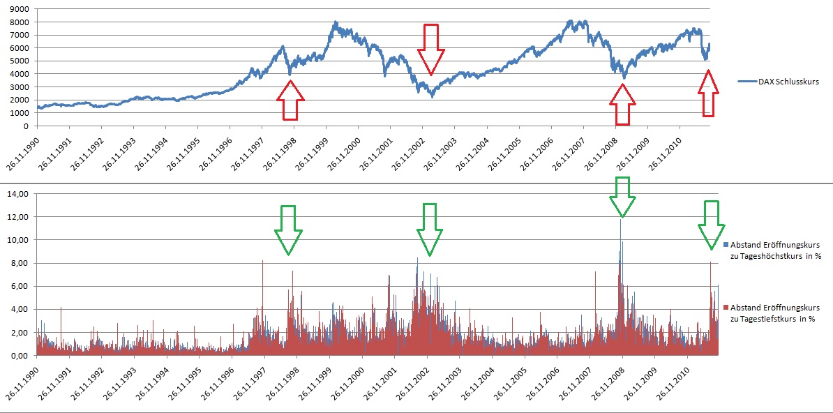 Starke Kursschwankungen (die wirklich richtig heftigen) treten niemals während eines Kursanstiegs oder Kursfalls auf. Sondern immer nur am Ende eines Kursfalls und nie am Ende eines Kursanstiegs.