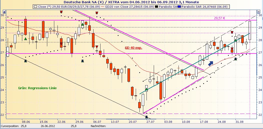 Dies ist allerdings nur eine mögliche Entwicklung, denn das beschrittene Terrain ist wie gesagt gefährlich. Doch endlich hat jemand den Mut gefunden, einen möglichen Weg einzuschlagen. Mal sehen, ob die Politik diese Richtung gehen läßt. Vor allem bin ich sehr gespannt auf die ersten Taten bzw. Käufe durch die EZB.