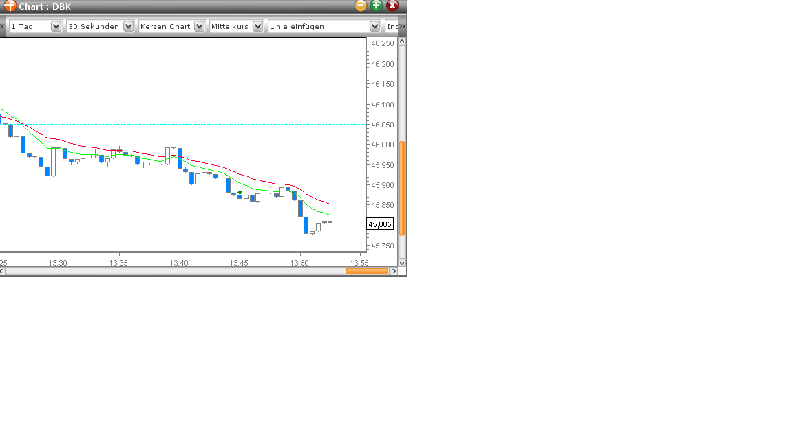 was hast du für einen Perioden-Zeitraum. Grün ist bei mir Gleitender Durchschnitt 6 Tage und rot sind es 20 Tage. Hast du exponentiell oder was anderes?