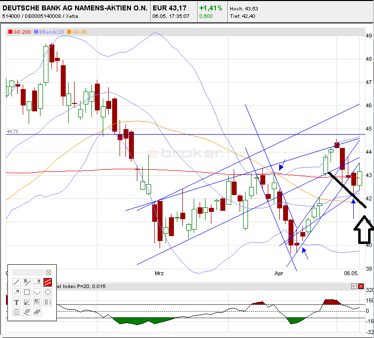 Was eine DB macht, kann ich nicht einmal erahnen. Eine konjunkturabhängige Aktie die bei den Märkten der letzten Wochen nicht hochgegangen ist? Ich habe keine Ahnung, aber das CRV stimmt bei der DB am allerwenigsten. Die an der 43 einfach nicht drüber gekommen ist. Ein Investor der auf Tages bzw. Wochenbasis handelt, der muss den Stop fast an die 39 legen für ein CRV=2 wären das 8-9 Euro die die Aktie gewinnen müsste während im DAX eine hohe Wahrscheinlichkeit für eine mittelfristige Korrektur ansteht. Ist es wahrscheinlich, dass eine DB 8-9 Euro (über 20%) zulegt während der DAX konsolidiert? Ich glaube das nicht. Das Risiko ist meiner Meinung viel größer als die Chance auf 48-55 Euro. Eher am Jahresende ist das wahrscheinlich, bis man weiß, wie Griechenland, Portugal usw. gehandhabt wird.