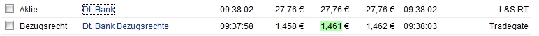 Kannst du doch selber ganz einfach prüfen. Nimm den Kurs von gestern und vergleiche es mit der Summe aus Bezugsrecht plus aktuellem Aktienkurs. Die Differenz zeigt dir dann was Sache ist. Aktuell liegt der Bezugsrechtkurs bei ca, 1,42. Schlusskurs vom Mittwoch war z.B. 29,72 Euro. Rechnerischen Preises für die Bezugsrechte war da 1,57 Euro. Ab heute werden die BZR ja gehandelt, d.h. auch Leute die garkeine DBK-Aktien bislang hatten können sich durch Kauf von Bezugrechten die neuen Aktien dann zu 22,50 sichern. Da der BZR-Kurs auch vom aktuellen Marktkurs abhängt, werden BZR immer billiger je weiter der Aktienkurs noch fällt. Wer als Big Boy im größeren Stil günstig BZR kaufen will, dem kommt es nicht ungelegen erstmal zu schauen wie lange der DBK-Kurs noch weiter sinkt bevor man zuschlägt. ( oder man agiert aktiv um den DBK Kurs weiter zu rücken) => Kurse Bezugsrechte http://www.ariva.de/quote/simple.m?secu=116115470