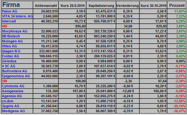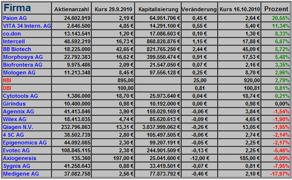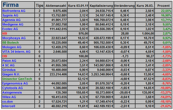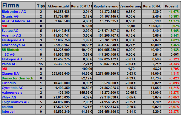 Nächstes Jahr mache ich kein Spiel und keine Statistik von deutschen Biotechs mehr. Das hat verschiedene private Gründe. Vielleicht übernimmt ein anderer . So ein Gesamtüberblick schadet nicht.