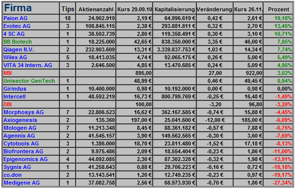 Ich werde jetzt Ende Dezember noch mal nachfragen, ob Änderungen für das Biotechjahresdepot 2011 vorliegen. Da hat man dann aktuelle Kurse und kann aufgrund neuester Daten entscheiden. Also bitte erst die Änderungen kurz vor Start.