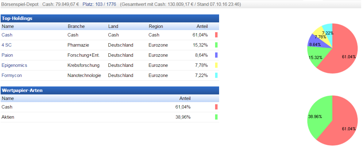 Anavex und Amp Biosimilars Anavex mit schlechten Ergebnissen mit Kurseinbruch und der erwartete Abverkauf bei Amp Biosimilars drücken den DBI Deutschen Biotech Index wieder auf unter -10%. Eigentlich keine Werte die man im Depot haben sollte, doch der Index wird dadurch doch gravierend in Mitleidenschaft gezogen. Das Biotechdepot notiert bei etwa 23,5% im Plus. Bis auf die zwei Werte Evotec und Formycon bei denen ich noch Nachrichten erwarte sind keine Werte mehr im Depot. Die Cashquote liegt im Augenblick bei sehr hohen 74%. Bei einigen Werten warte ich auf einen günstigen Einstieg. Zur Zeit fehlen mir die Investitionsmöglichkeiten. So heißt es halt auf die Chancen warten. Ich wollte mir jetzt auch nicht mehr die gute Performance dieses Jahr versauen. Spekulativ könnte ich noch Cytotools und Probiodrug nehmen, doch noch ist das Risiko einfach zu groß. Probiodrug würde bei schlechten Ergebnis ebenso wie Anavex gnadenlos abgestraft. Bei Alzheimer Wirkstoffen ist die Möglichkeit eines Scheiterns enorm hoch. Deshalb werde ich das Risiko nicht eingehen. Im Chartbild wird das Biotechdepot im Vergleich zum S-DAX gezeichnet. Der DBI Deutsche Biotechindex steht wie oben schon erwähnt heute bei ca 10% im Minus. Die Platzierung zur Zeit etwa bei Position 150-160 von knapp 1700 Teilnehmern. Ich bin zufrieden.