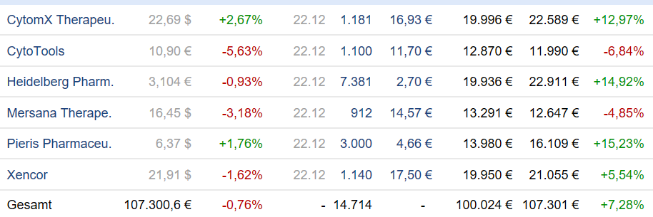 Ich möchte in der Folge die Depotwerte ein wenig beleuchten. Einer dieser jetzt 5 Werte ist Heidelberg Pharma, der neben Pieris der einzig verbliebene Wert aus Deutschland ist. Kurz noch die Situation zum DBI und zum NBI. Ich bin weiterhin bei vielen deutschen Werten sehr vorsichtig. Einige scheinen jetzt einige Erholungsversuche zu starten. Doch ich werde dieses Jahr wohl nicht mehr agieren, da wohl noch bei vielen Werten jetzt aus steuerlichen Gründen die Positionen bereinigt werden.