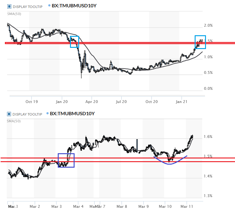 bleibt somit weiter überschritten bei den 10Y T-Bonds( gab nur nochmal einen kurzen Pullback daran). Das steigende Level bedeutet für den Aktienmarkt normalerweise tendenziell weiter eher einen Druck auf überteuerte Tech-Werte , besonders mit höherer Fremdfinanzierungsquote, umgekehrt mehr Hinwendung zu zyklischem Value und zinssensibel Finanzwerten. Mal schauen, ob diese Tendenz an den Bond-Märkten sich so weiter fortsetzen wird. ( 10-year Treasury yield rebounds back to near high for the year -Fri, Mar 12 202 www.cnbc.com/2021/03/12/...llowing-stimulus-vaccine-news.html "...The 10-year yield has risen rapidly recently, shooting up from 1% since the end of January, amid concerns about rising inflation. These concerns have been compounded by fears that the U.S. government’s fiscal relief package, alongside the reopening of the economy, could stimulate it too quickly and cause a surge in prices. , www.godmode-trader.de/artikel/...wie-ein-stein-fallen,9224703 , www.boerse-express.com/news/articles/...-helge-mueller-303622 )