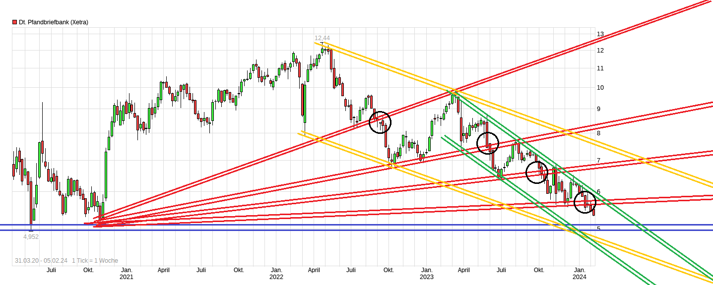 Problem ist hier wohl weiterhin, daß zum einen die anhaltende Sorge bzgl. möglicher weiterer Rückstellungen eher wächst und auch die grundsätzlichen operativen Probleme sich in dem Sektor länger in 2024 hinziehen dürften als gedacht. Und auf der anderen Seite ist halt auch das charttechnische Bild weiterhin noch immer negativ. Somit könnte es durchaus sein, daß es sogar etwas unter die von dir angesprochenen 5€ nochmal geht, solange sich an den eben genannten Dingen nicht wieder etwas entscheidend ändert. Das Tief von 2020 lag bei 4,95€. Also unter 5€. Vielleicht kommt es dann in der nächsten Zeit wirklich nochmal zu einem Test dieser Marke. Und je nach den Fakten und Aussagen, die bei den nächsten Zahlen verkündet werden, dürfte sich zeigen, ob damit genug Pessimismus bereits einpreist ist. Wäre natürlich schön, wenn sich dabei zeigen könnte, daß die bereits im Vorfeld jetzt eingepreisten Sorgen unnötig größer sind als die Fakten es zeigen. Aber da muß man eben erstmal warten bis diese Fakten auf den Tisch kommen. Auf etwas längere Perspektive gesehen sollte es durchaus wieder Kurse geben die sich doch weiter von der 5 nach oben wieder entfernen. Besonders wenn die Zinssenkungsphase mal wieder etwas weiter fortgeschritten sein sollte. Kurzfristig bleibt nur weiter unklar von welchem Ausgangspunkt unten aus. Und würde sogar die 4,95€ mal fallen, dann gäbe es vermutlich nochmal eine weitere Welle nach unten im Anschluß. Würde mich daher nicht überraschen, wenn eher vorsichtige Gemüter bei der Aktie noch weiter am Seitenrand bleiben werden solange nicht wieder ein Zahlen&Prognose-Update kommt was etwas die Lage etwas besser wieder aussehen läßt.