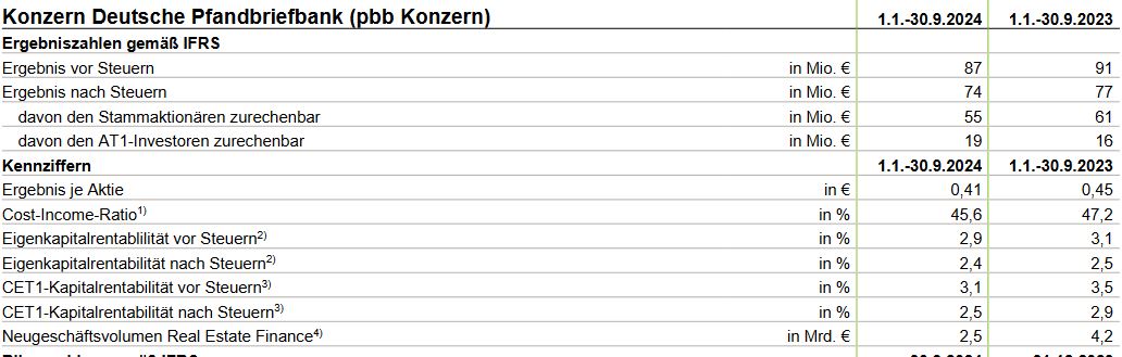 Nicht der große Befreiungsschlag aber Ergebnis ungefähr auf dem Vorjahresniveau! https://www.pfandbriefbank.com/fileadmin/...ember_2024_geschuetzt.pdf